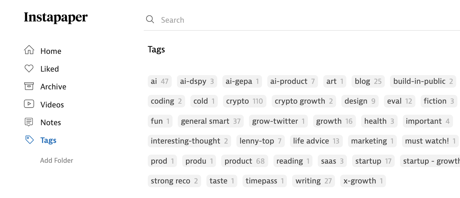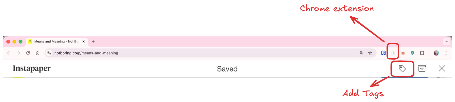 After some research, I landed on Instapaper. It has the typical chrome extension flow that can you can click on and save to your read-later queue, with the ability to add tags on the link (remember tags for they are the hero of the story)