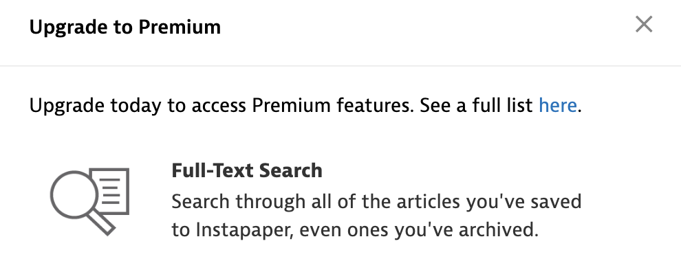 Now, Instapaper is a freemium tool that, rightfully so, blocks a few important functionalities - biggest of which is search.
