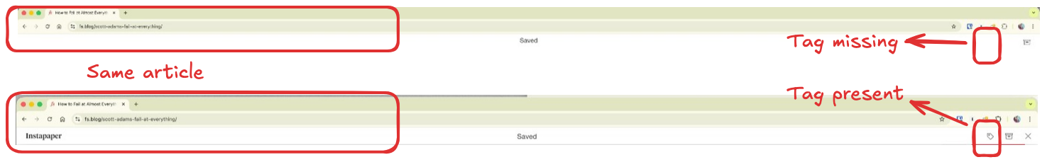For the past ~6-7 months of using Instapaper, I couldn’t understand why, when I click on the chrome extension, the tag sometime appears and sometimes doesn’t.