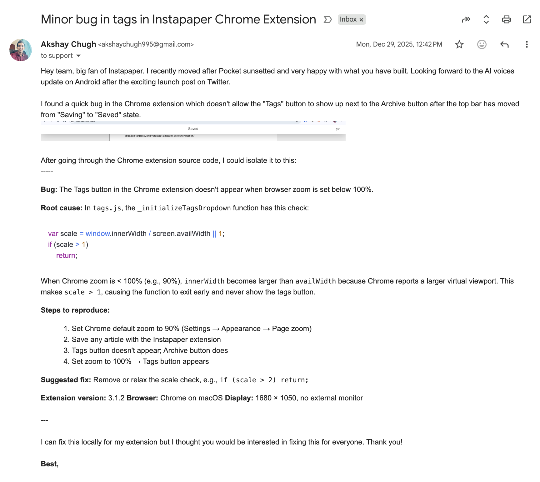 And then I waited and waited. But ofc, it was the holidays and this was a stupid small bug that no one cares about and will never be prioritised. I also realized that the Chrome extension was last updated in Nov’24, so ofc no way this thing gets prioritised.